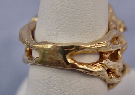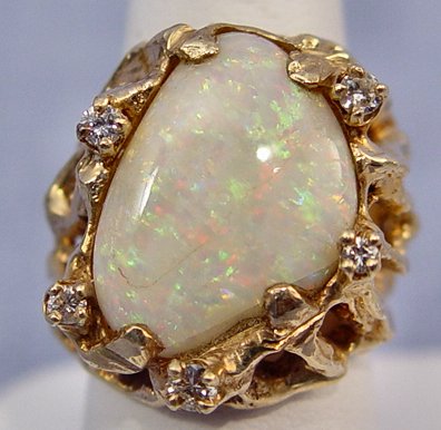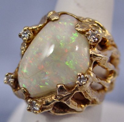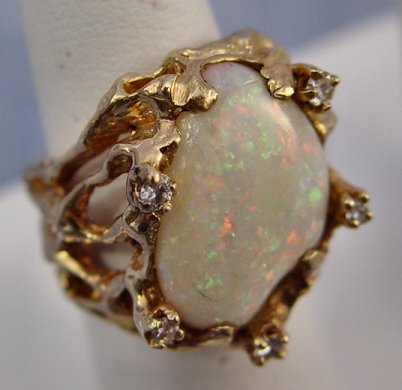 LARGE OPAL AND DIAMOND RING: 14k yellow gold mounting of a naturalistic form supports the large free form opal, please note crack to top this stone that is large enough to be recut, accented by five tiny diamonds, size 6.75, 18.2 grams.