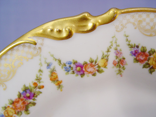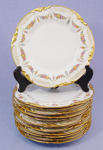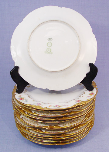 13 FINE FRENCH LIMOGES SERVICE PLATES: Jean Pouyet, Ca. 1891-1932. Hand painted gold border, transfer floral swag design. 9 1/2'' dia.