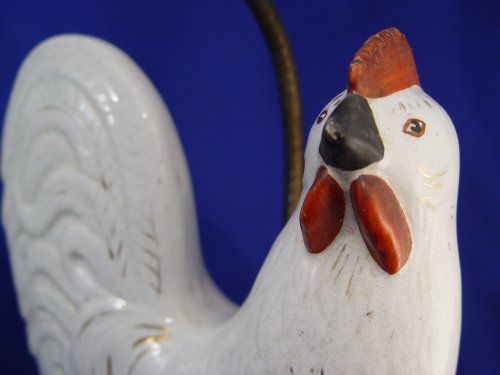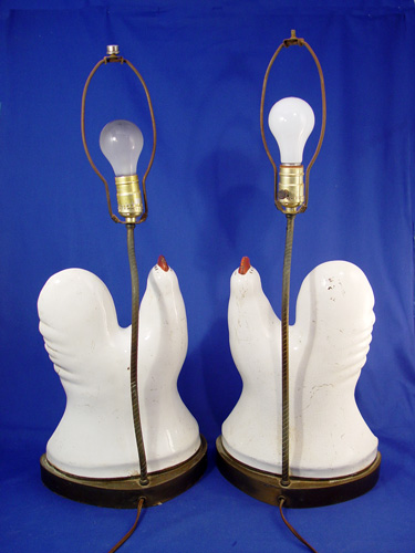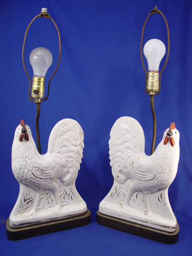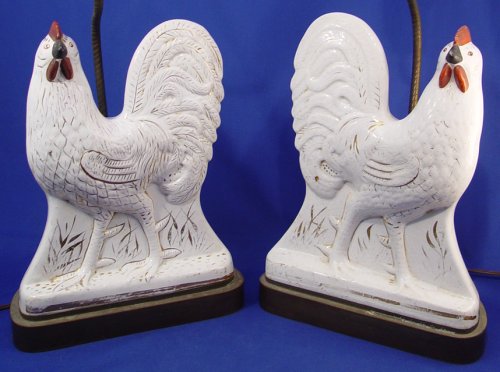 LARGE PAIR OF 19TH C STAFFORDSHIRE CHICKEN FIGURES: Mounted as lamps, the figures are 12''h., the lamps are 25'' overall. Please note one chicken has more gold than the other.