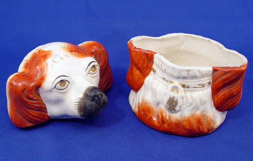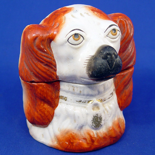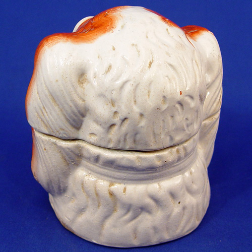 19th C STAFFORDSHIRE TOBACCO JAR: In the form of a St. Charles spaniel. Please note interior hairline. 5 3/4''h.