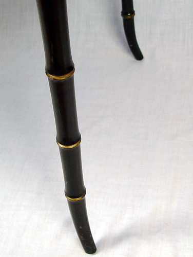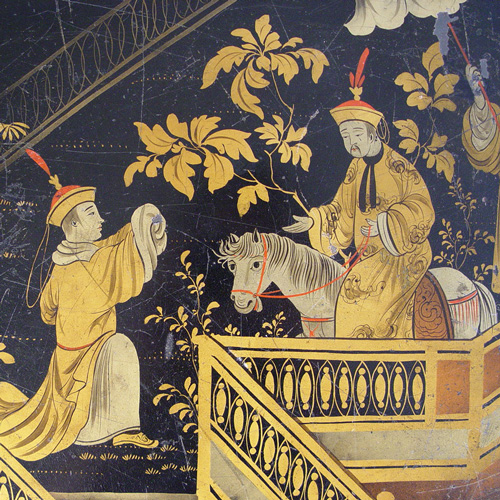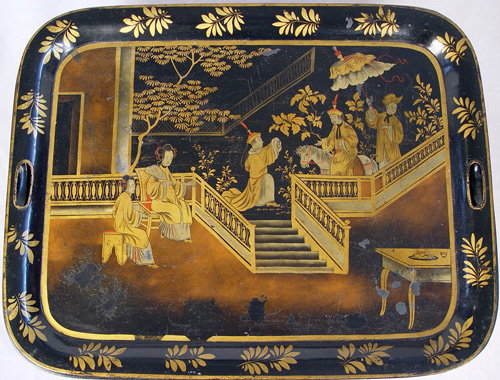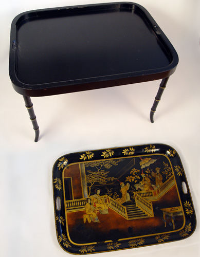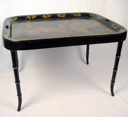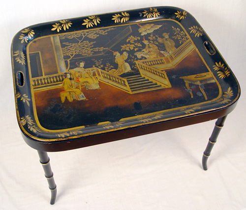 ORIENTAL MOTIF TEA TABLE: Black lacquer stand with a removable tole tray in an oriental genre scene, 30 1/4'' x 23 3/4'' x 19''h. Please note minor paint loss. Est. $400/600**