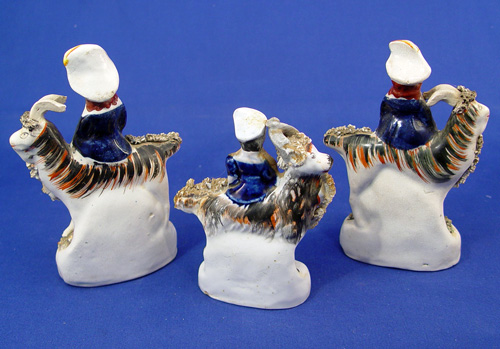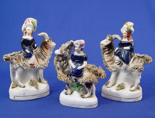 GROUP OF 3 19TH C STAFFORDSHIRE QUEEN VICTORIAS CHILDREN ON GOATS: A pair with a boy and a girl, 6 1/4'' and a smaller child on a smaller goat, 4 1/2''h.