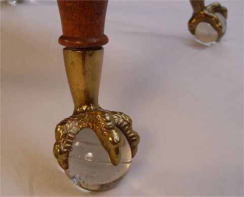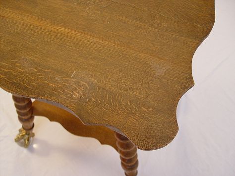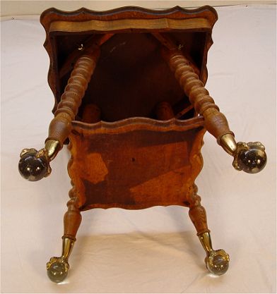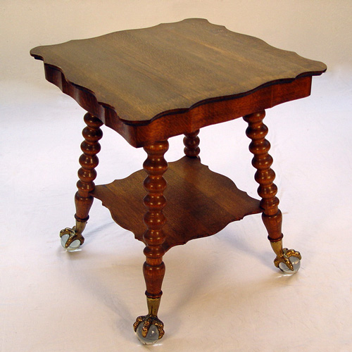 VICTORIAN GOLDEN OAK PARLOR TABLE: Two tier oak table featuring spiral carved legs ending in glass ball and claw feet. 29 1/2''h. x 26'' x 26''.