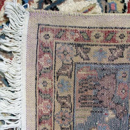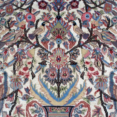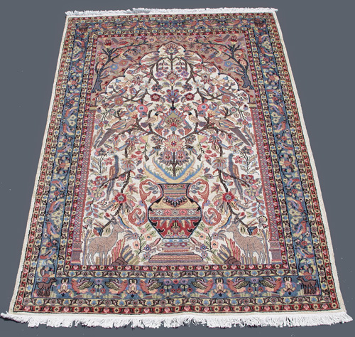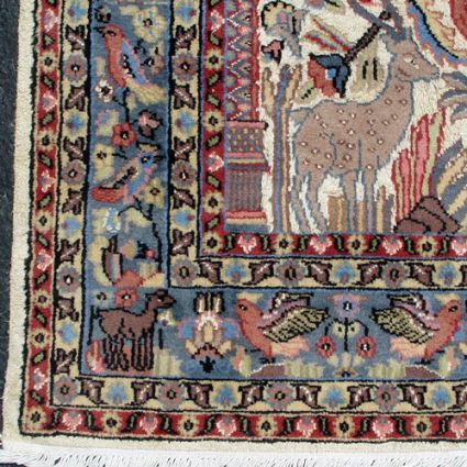 PASTEL CARPET WITH ANIMAL BORDER AND URN: Approx. 6' x 10'. in shades of blue and rose.