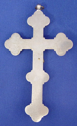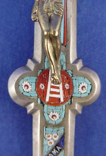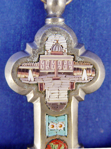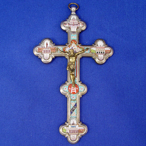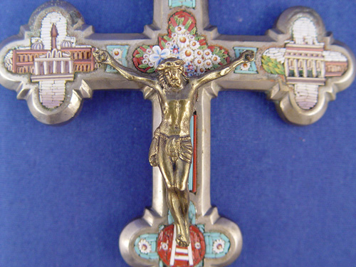 ITALIAN MICRO MOSAIC CRUCIFIX: Silvertone metal cross inlaid in a mosaic of micro tiles showing the Vatican, applied brass Corpus. 6 1/2'' x 3 1/4''. Sold with the presentation box.