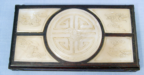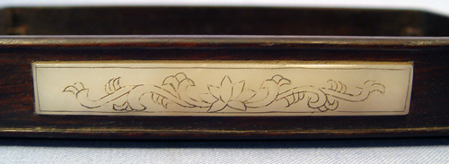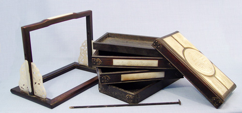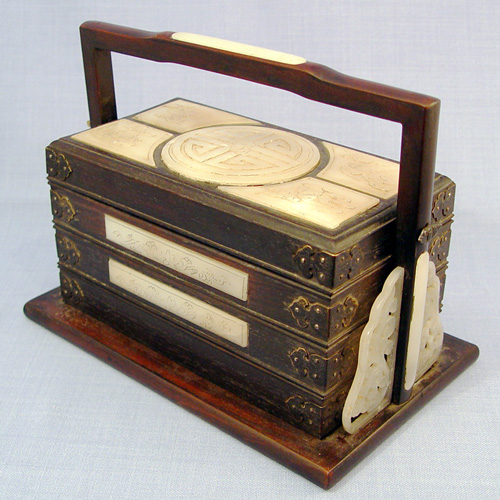CARVED JADE AND ROSEWOOD STACKING BOX: Four compartments stack and fit into holder with handle. 7 1/2''h. x 10 1/4'' x 6 1/2'' overall.