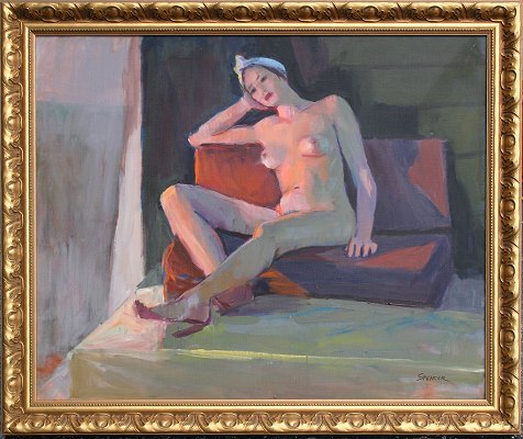 SEDUCTIVE NUDE OIL PAINTING SIGNED SPENCER: Seated nude female in high heels, O/C, 24'' x 30'', signed, in a fine gilt frame, 28'' x 34''. Abrasion with no paint loss. Est. $400/600**