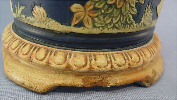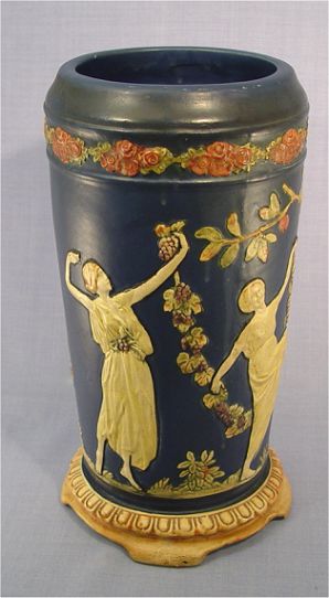 WELLER POTTERY ''BLUE WARE'' LAMP/VASE: With dancing nymphs, factory drilled for use as a lamp. 13 1/4'' h.