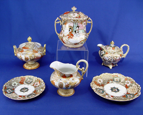 JAPANESE SATSUMA: 1) Artist signed set of covered jar holder with underplate and cream pitcher with underplate, 5 1/2 and 4''h. 2) Cream pitcher and sugar, 4 and 4 1/2''h.