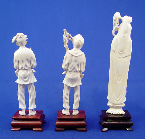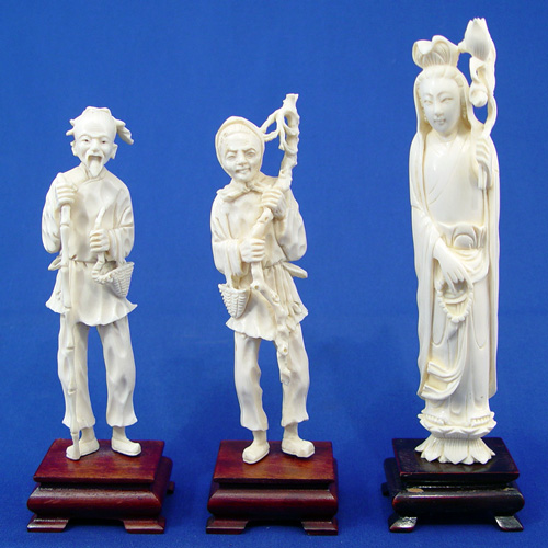 3 ORIENTAL CARVED IVORY FIGURES: Nicely detailed carvings, 6 - 7 1/4''h. excluding the carved wooden stands.