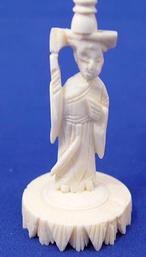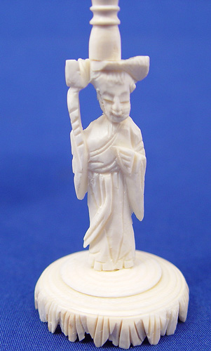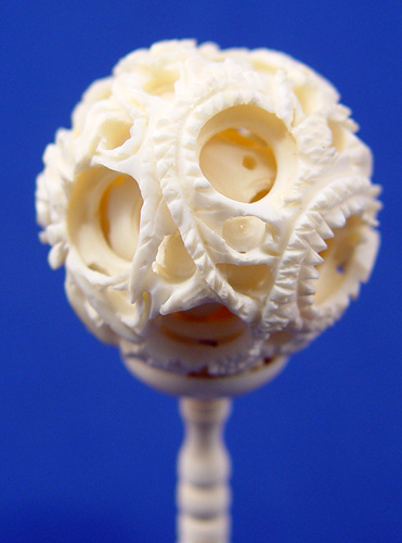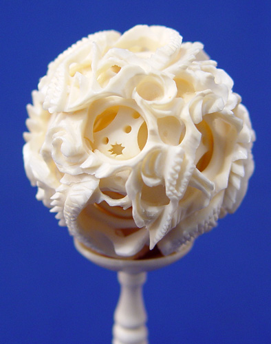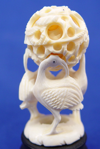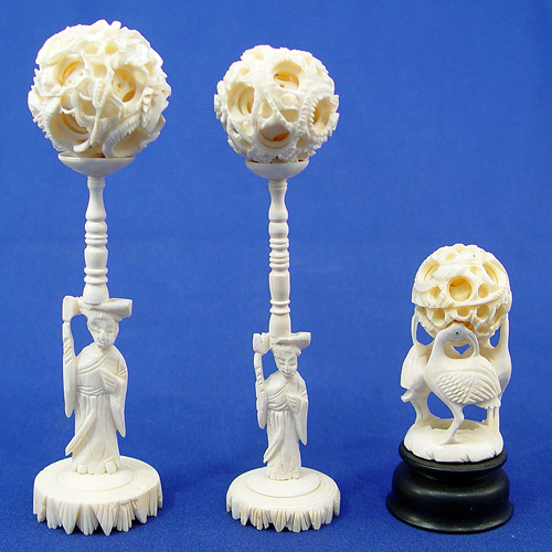 3 CARVED IVORY MYSTERY BALLS ON STANDS: Three cranes holding a ball, and two mystery balls on figural stand. 2 1/2''-6'' high.