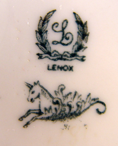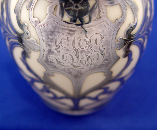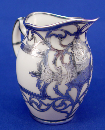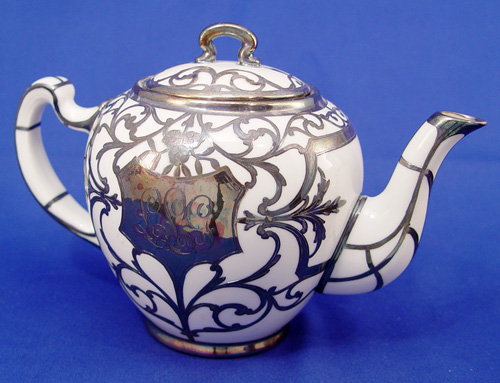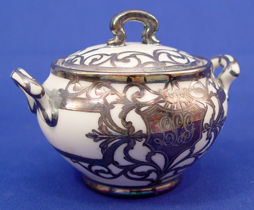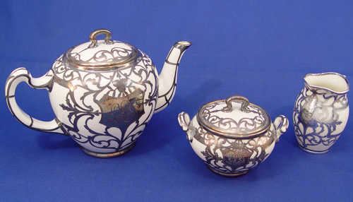 LENOX SILVER OVERLAY 3 PIECE TEA SET: Heavy silver overlay on Lenox cream finest porcelain. Green mark with the hors. The pot is 6''h, the cream pitcher, 4'', the covered sugar, 3 1/2''.