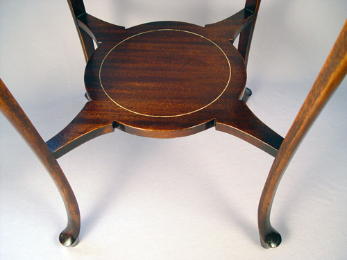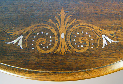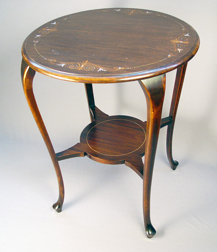 ART NOUVEAU MOTHER OF PEARL INLAY TABLE: Mother of pearl and marquetry inlay mahogany, two round tiers with lower connecting tall cabriole legs. 29''h. 23 1/2'' dia.