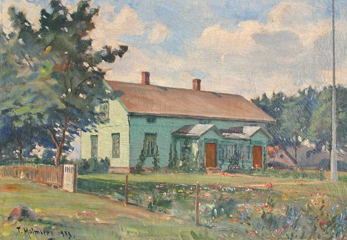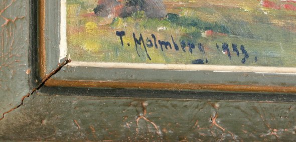MALMBERG, Thure, (Finnish, 1894-1968): Country Landscape with Farmhouse, O/C, 15'' x 19'', signed and dated 1953, worn period green frame, 19'' x 23''. Cracklure with several paint flecks, 2 minor pinholes. Est. $300/500**