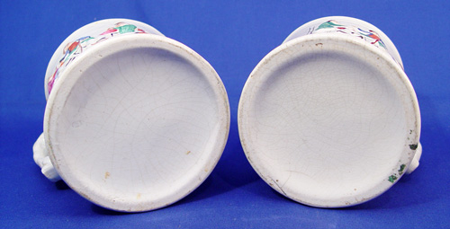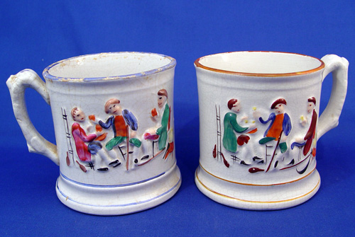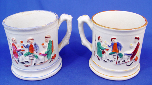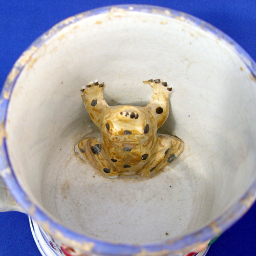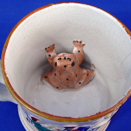 TWO 19th c ENGLISH FROG MUGS: Raised tavern scene on each, one with blue edge, one with brown. 4 3/4''h., the mug is 4 1/2'' dia. Overall general crazing and wear. Otherwise known as a toad or surprise mug, frog mugs were first made as a practical joke, but now highly collectible.