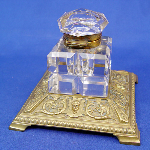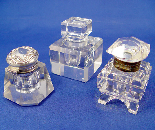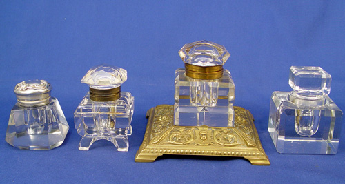 4 GLASS INK WELLS: The largest (3 1/2'') in a lion head and masqueron brass stand, the smallest (2 3/4'')with a sterling lid. Two have hinged lids, two have stoppers. All are free of chips or cracks.