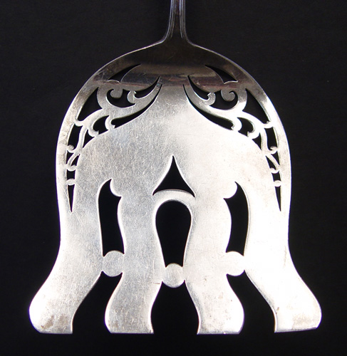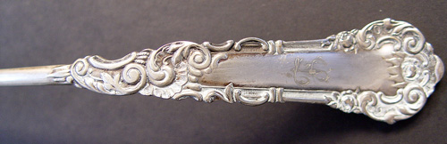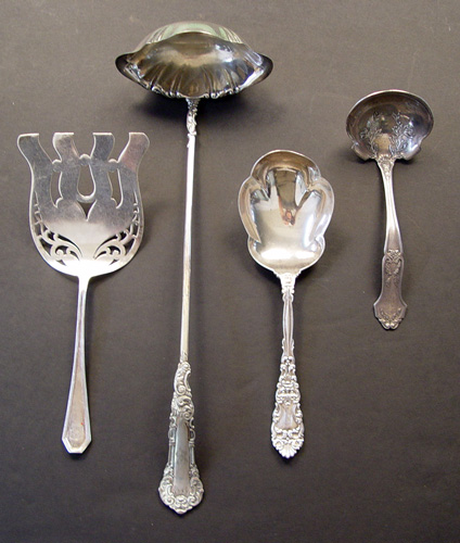 SUPER STERLING SERVING PIECES: 1) Dominick & Haff ''Renaissance'' large solid berry or casserole spoon, 9''l. 2) Dominick & Haff ''Queen Anne'' Fried oyster or entree server, 9 3/8'' 3) International gravy ladle, 7 1/8''l 4) Sterling? Wm. Rogers punch ladle, 14 1/2''l.