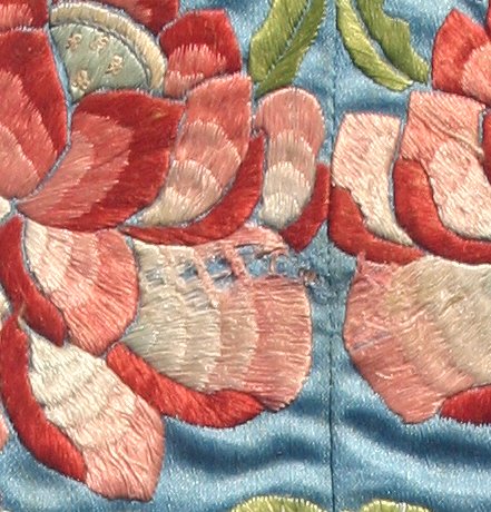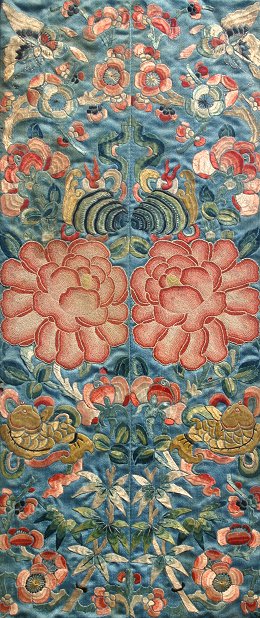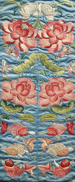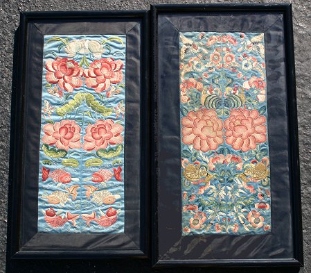 PR 19TH C FORBIDDEN STITCH SILK FRAMED EMBROIDERIES WITH BUTTERFLY & GOLDFISH DESIGNS: 16 1/2'' x 7'' sight size, matching black laquer frames, 27'' x 17'', some staining and minor damage, sold as is.