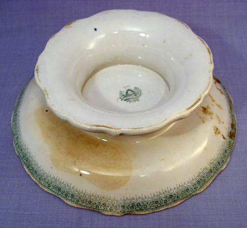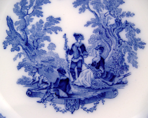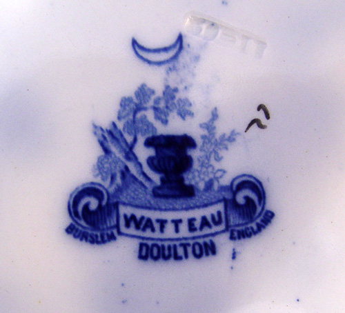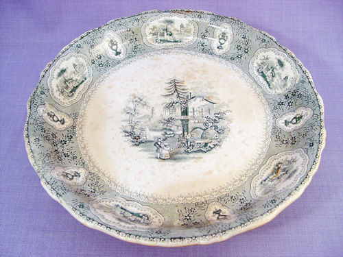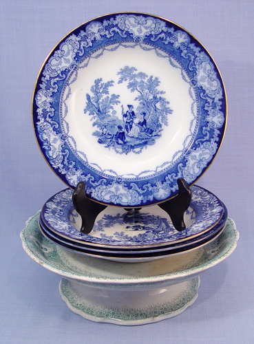 4 DOULTON FLOW BLUE ''WATROUS'' SOUP PLATES: The large soup plates are 10 1/2'' dia. One is excellent, 2 are discolored and 1 has a chip. Sold with a 19th C green transferware pedestal bowl, 12'' dia.
