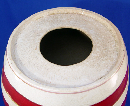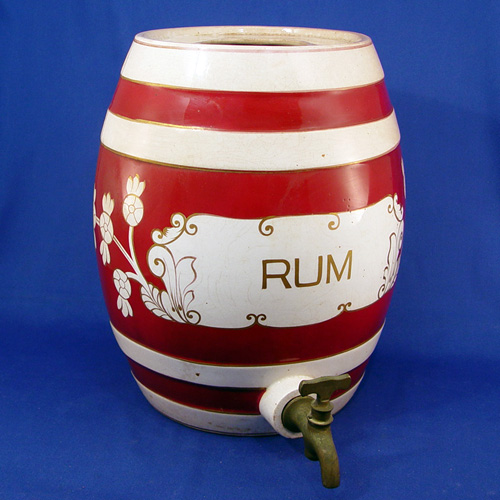 19TH C ENGLISH STONEWARE RUM KEG: Working metal spigot in stoneware, gold lettering and decoration. 12 3/4''h., 8'' dia. at the rim.