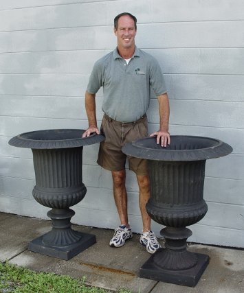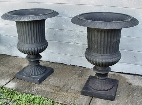 PAIR OF CAST IRON GARDEN URNS: Black painted cast iron, approx. 38''h., 30''dia. at outer edge, 12'' dia. interior pot space.