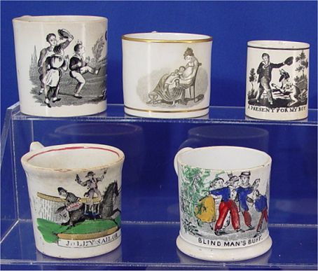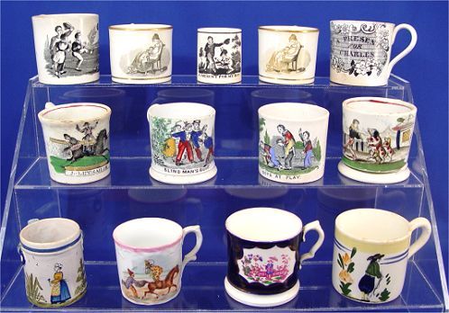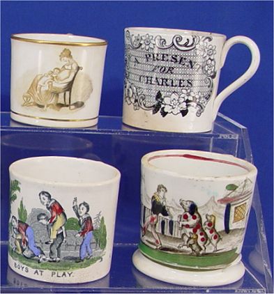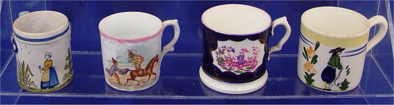 ESTATE COLLECTION OF STAFFORDSHIRE JUVENILE OR CHILD'S MUGS: 10 Staffordshire, 1 German and 2 Quimper. The English cups include luster, transfer and Gaudy. Titled ''Boys at Play'', ''Blind Mans Bluff'', ''Present for My Boy'', ''Jollys Sailor'' and ''Present for Charles''. There is a Japand pattern, boys playing football, and mothers with babies. The German mug is circus ponies. One of the Quimper is signed HB Quimper. The smallest mug is 2 1/4'', the largest is 2 3/4''.