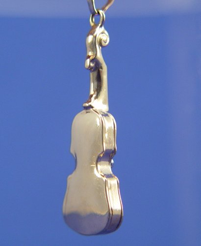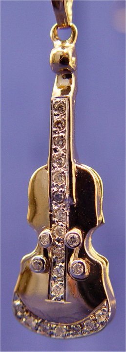 14K GOLD & DIAMOND VIOLIN PENDANT: For the music lover in your life. Figural pendant of 14k yellow gold in the shape of a violin, set with approx. 20 pts of tiny white diamonds. Bail marked 14k 585, approx. 1 7/8''l., 5.3 grams.