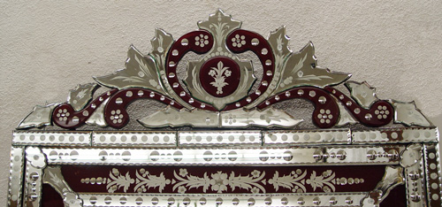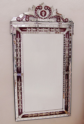 LARGE VENETIAN GLASS MIRROR: Etched and tiered frame with a ribbon of red glass between the looking glass and frame. 6' tall x 3'3''.