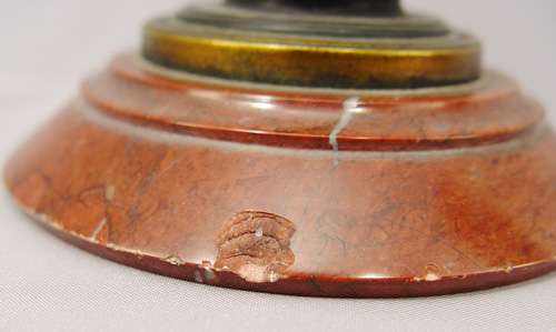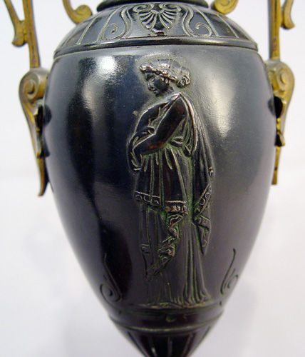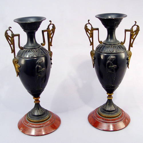 PAIR BRONZE GARNITURE: Embossed image of a classic Roman figure on each, red marble base, gilt metal handles, 10 1/2''h.