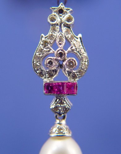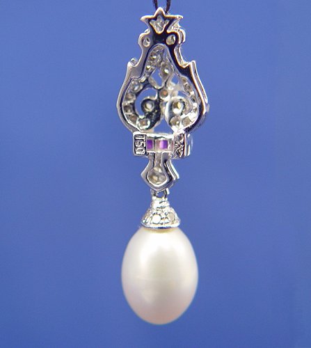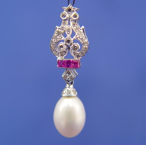 PEARL, RUBY AND DIAMOND PENDANT: 18k white gold pendant encrusted with single cut diamonds, approx. .17ctw, three square cut rubies, approx. .10ctw above the 7 x 9mm white cultured pearl, 1 1/8'', 1.6 grams.