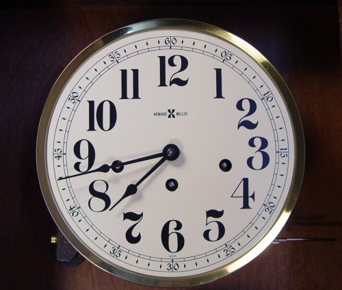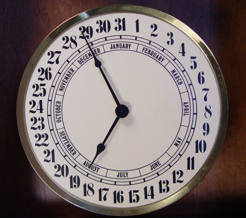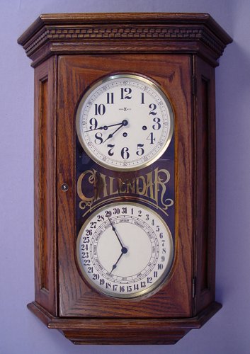HOWARD MILLER CALENDAR CLOCK: Modern version of an old standard, created by Howard Miller. Two dials, one for hour and minute, the other shows day and month. Housed in an oak wall hanging case, the letters on the glass are 24K gold. 28'' tall. x 16 3/4'' x 6''. All clocks and watches are sold as not working, due to their delicate nature, even though they may be just fine.
