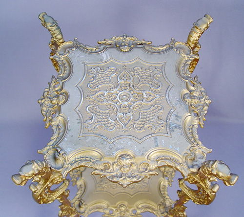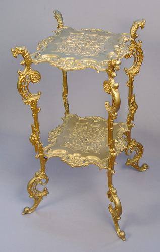 VINTAGE CAST IRON DRAGON MOTIF FERN STAND: Dragons, cherubs, and roses. Gold painted finish. 29 1/2''h. x 13 1/2'' square overall.