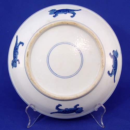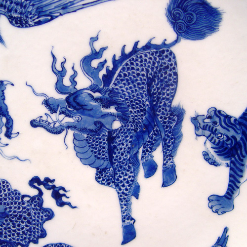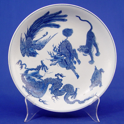 CHINESE FIVE ANIMAL BLUE AND WHITE CHARGER: Unsigned, 10'' dia.