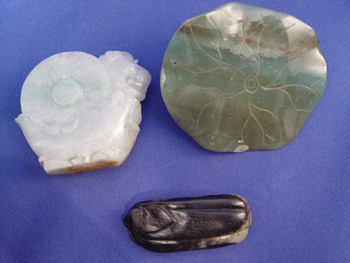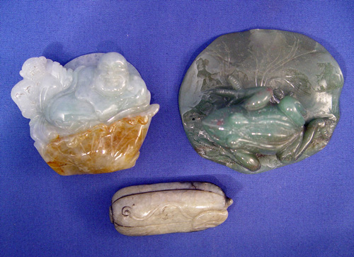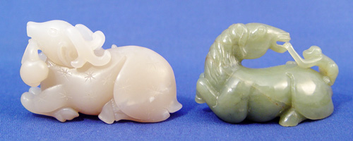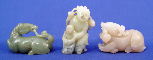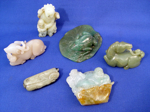 6 PIECE CARVED JADE MENAGERIE OF FIGURES: 1) Translucent jadeite Happy Buddha, 2 1/4''h. 2) Jadeite frog on a lily pad, 3 1/4''l. 3) Jade horse with a monkey, 1 3/4''h. 4) Jade carving of a deer, 1 1/2''h, 2 1/2''l. 5) Jade man with boy, 2 1/2''h. 6) Carved jade melon, 2 1/4''l.