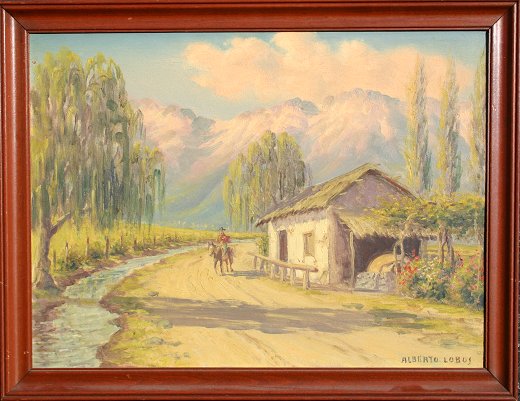 LOBOS, Alberto, (Chilean, 1892-1925): Rural Scene with Huaso on Horseback, O/C, signed, worn frame. Alberto Lobos and his brothers Enrique and Alfredo were all members of the ''Generation of Thirteen'' (meaning the year 1913), a bohemian group recognized as the best artists of their time in Chile, the very early 20th century. They were all students of the same mentor, one Maestro Fernando Alvarez de Sotomayor(1875-1960), a Spaniard imported to Chile by its government to lead the program at the Escuela de Bellas Artes de Chile.