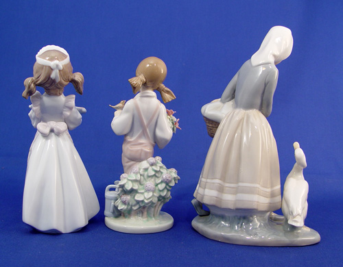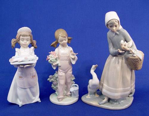 3 LLADRO FIGURES: 1) ''Spring, girl with flowers and water can, #5217, 7 3/4'' tall. 2) ''Dinner is Served'', girl with platter of fish, 7 1/2''h. 3) ''Shepherdess with Ducks'', #4568, please note loss of finger, 9 1/2''.