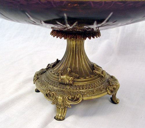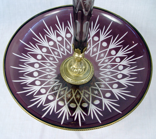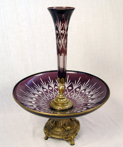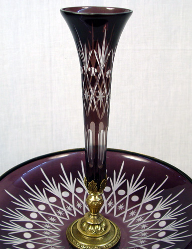 AMETHYST CUT TO CLEAR CENTER PIECE: Low bowl on an ormolu base 16''dia, centered by a ormolu supported epergne vase, 22''h. overall.