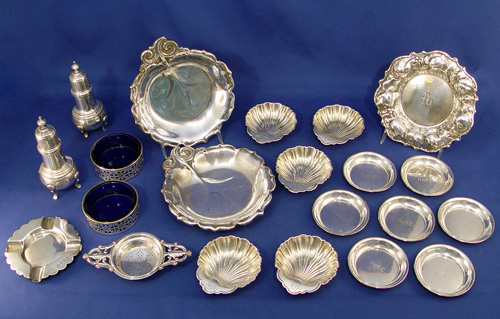 ESTATE STERLING LOT: Multi piece lot to include, pepper and salt with cobalt inserts by Graff, Washbourne & Dunn; lemon strainer by Webster; five shell shaped nut dishes by Gorham, monogrammed HdeBC; seven butter pats, unidentified mark, monogrammed HdeB.C; foliate embossed dish by Whiting, 5 3/4''dia.; two floral dishes with foliate handles by Frank Smith Silver Co, marked Bailey Banks & Biddle Co, approx. 6 1/2'' x 5 3/4''; and an English individual size ashtray, Birmingham, 3 1/2''. Sold as a lot.