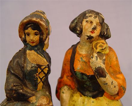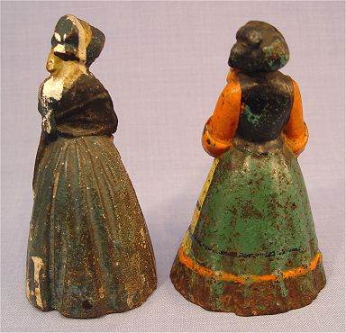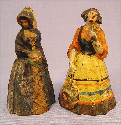 2 VINTAGE CAST IRON DOORSTOPS: 1) Southern Belle, 6 3/4''h. 2) Woman holding hat, 6 3/8''h. Both have original paint with wear, are full figured and solid.