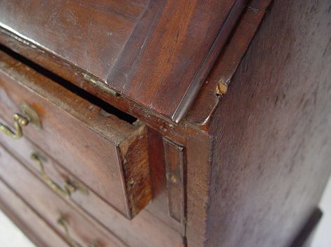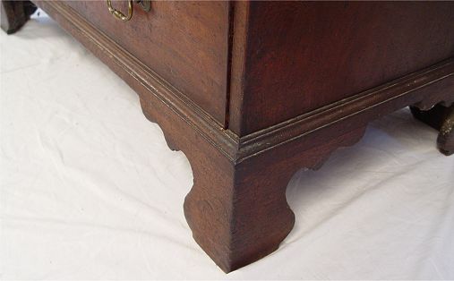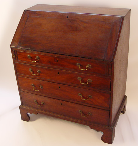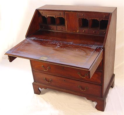 PERIOD CHIPPENDALE MAHOGANY SLANT FRONT DESK: Interior intact with shaped cornices, drawers and pigeon holes. Bracket feet, appears to be all original, evidence of termite damage. 42''h. x 37'' x 21''.