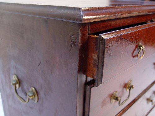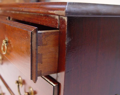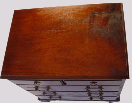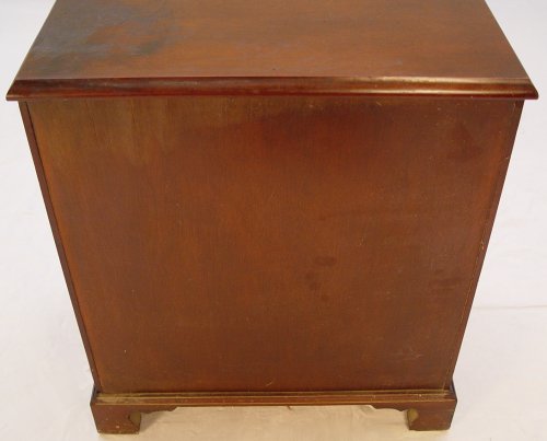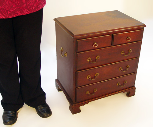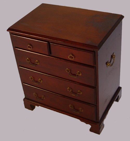 MINIATURE MAHOGANY SILVER CHEST: 2 over 3 drawer chest, bracket feet. Brass side handles and pulls. 23 1/4''h. x 20 3/4'' x 14 1/8''.