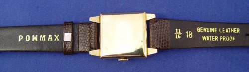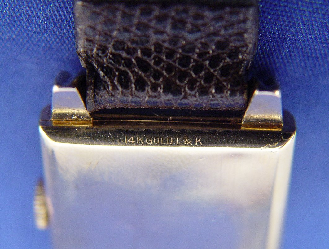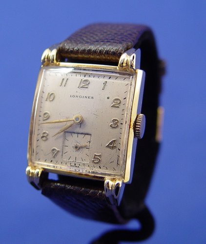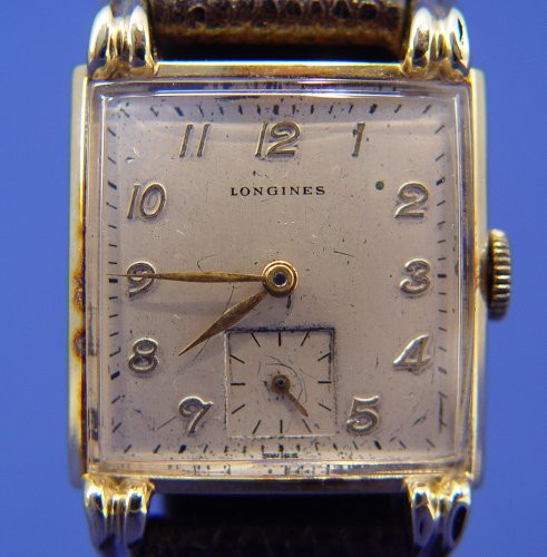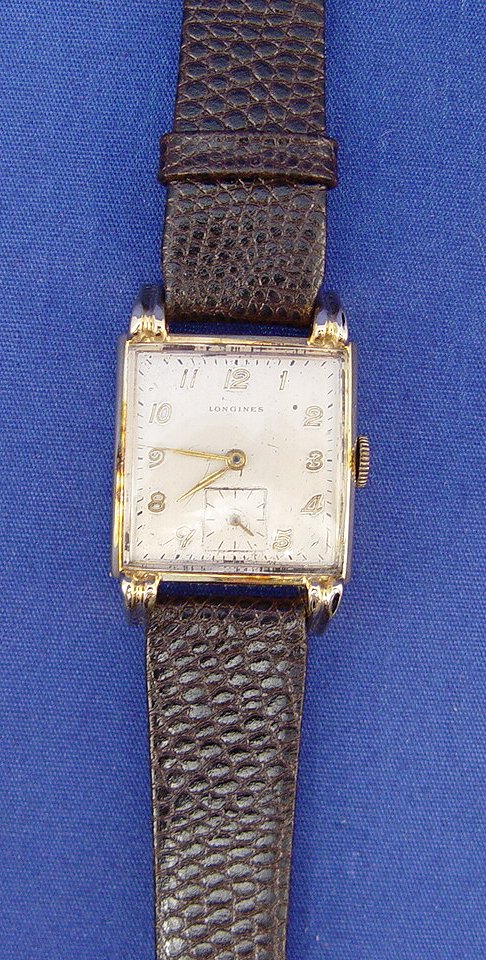 GENTLEMAN'S 14K LONGINES WRISTWATCH: Vintage rectangular case of 14k yellow gold, champagne dial with gold Arabic numbers and hands, some wear to dial, on a replacement leather band with a gold tone buckle, 9''l., case measures lug end to lug end 1 15/32'' and 1''w. All clocks and watches are sold as not working, due to their delicate nature, even though they may be just fine.