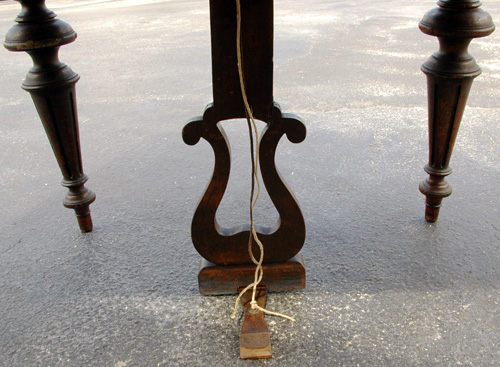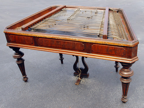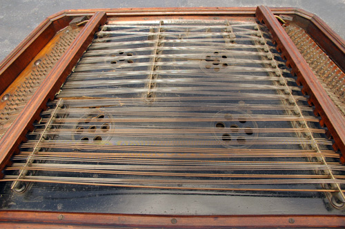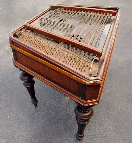 CONCERT CYMBALOM, LATE 19TH C HAMMER DULCIMER: Large hammered dulcimer with pedal controlled dampers, on four legs. Burled walnut veneer case. Found mainly in the music of Hungary, Romania, Greece and Ukraine. Please note small crack in sound board. Sold with the hammers. 37 1/2''h. x 64'' x 28''.