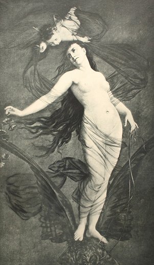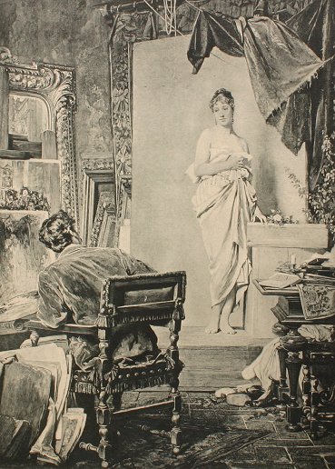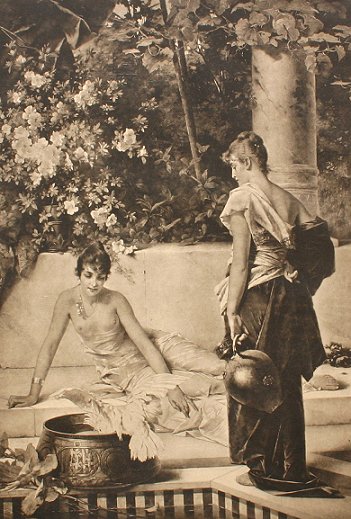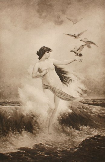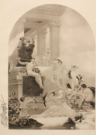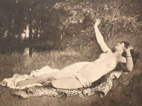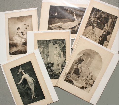 VINTAGE 6 PC NUDE MAIDEN PHOTOGRAVURE LOT: ''Bacchante Awakening'', after Kraus, ''The Daughter of the Sheik'', after Kiesel, ''Night'', after Rebouet, ''Profane Music'', after Dubufe, ''Aphrodite'', after Krusemark, all printed by Haskell Publishing, and ''The Artist and His Model'', after Kunst, printed by Fred Allen. Sold as a lot, under plastic, with acid-free board, with original title pages verso, all measure approximately 19'' x 12''.