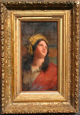 19TH C. ITALIAN O/CB PORTRAIT OF A MAIDEN: 9'' x 5'', unsigned, in period repaired gilt frame, 13'' x 9''. Some evidence of older inpaint, minor cracklure, needs cleaning. Est. $400/600**