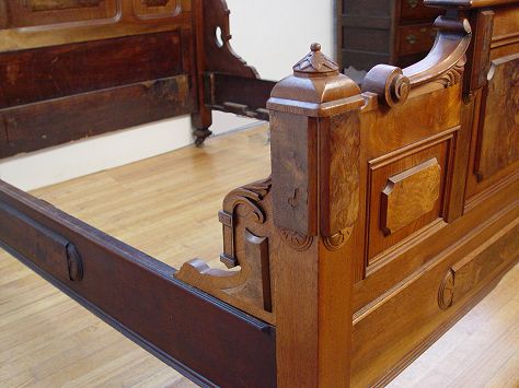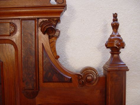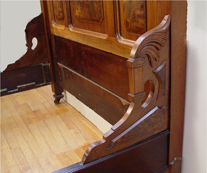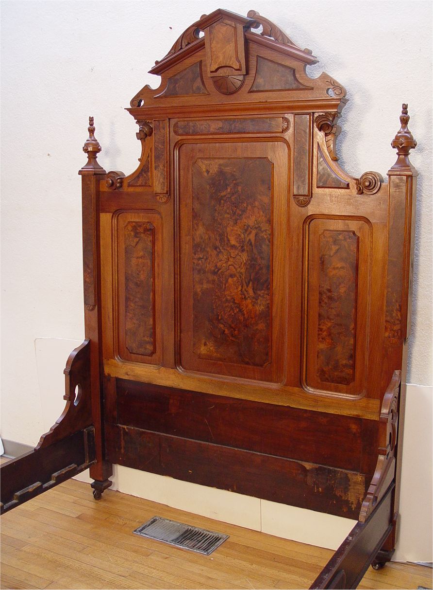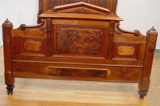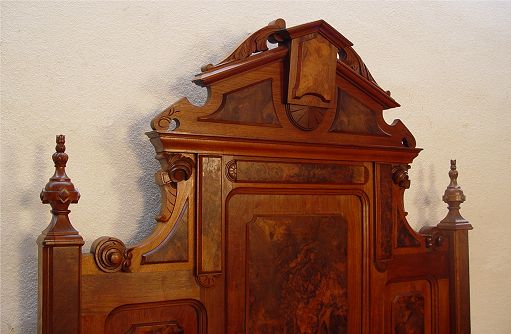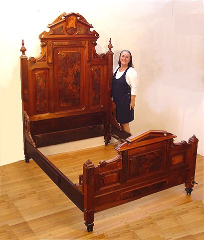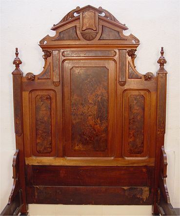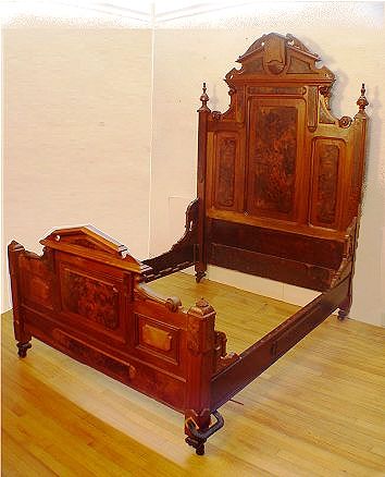 SUPERIOR HIGH BACK VICTORIAN RENAISSANCE BURL WALNUT BED: Ca. 1880's. Well decorated head and foot boards with deep burl panels, carved rondeau, and finials on the posts. The original and elaborate rails are included. The head is 85 1/2''h, bed is 58''w x 78''l.
