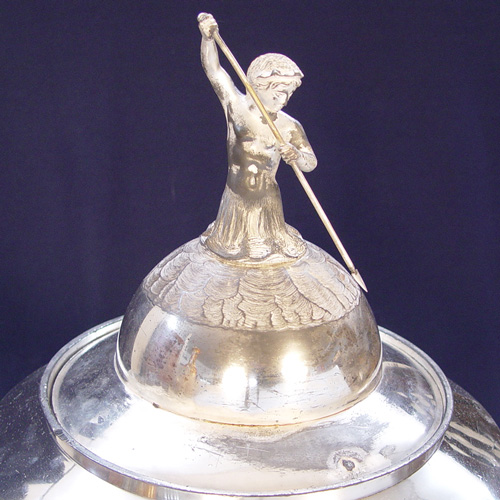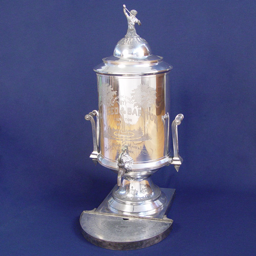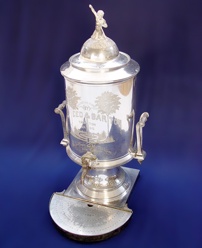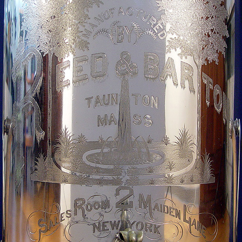 19TH C REED & BARTON SILVERPLATED ICE WATER URN: Ca. 1850-1875. Used at the Reed & Barton New York City showroom at 2 Maiden Lane. Silverplated urn with Neptune figural finial on the lid and fish form spigot. Double handles, square base, drip tray still intact. Sold with a letter from Reed & Barton identifying the piece. 36''h., the base is 12'' square. Est. $3000/4000**