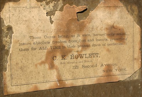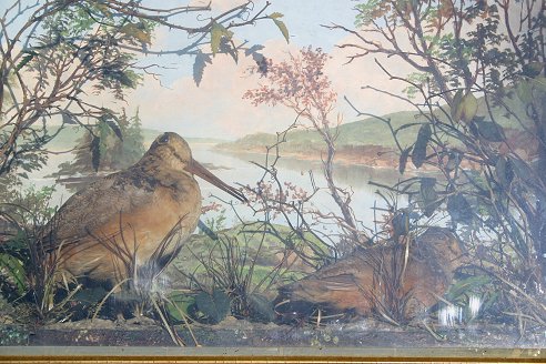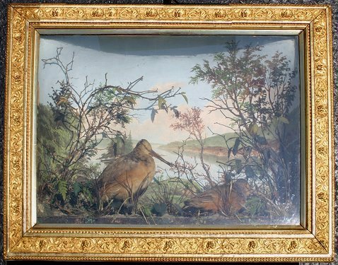 19TH C DIORAMA OF WOODCOCKS IN A HERMETICALLY SEALED CASE: CK Howlett New York designed the case, depicts two woodcocks in a hand painted landscape with faux greenery, overall 22'' x 30'' x approx. 6'' deep. Several areas of cracking in upper back portion of case.