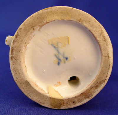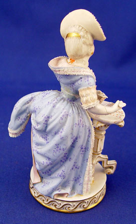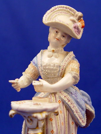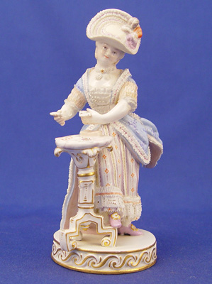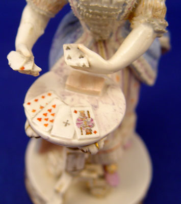 MEISSEN GERMAN PORCELAIN MODEL OF WOMAN DEALING CARDS: 6 1/8''h, blue cross swords under glaze. Please note condition.