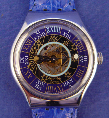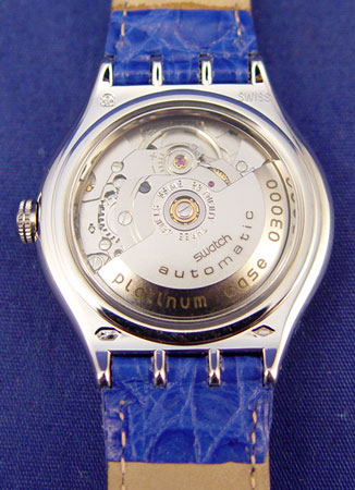 PLATINUM SWATCH TRESOR MAGIQUE AUTOMATIC WRISTWATCH: First limited, numbered edition Swatch. This special Swatch has Swiss movement, blue dial, exhibition back, center dial peek through, water proof, and is in a solid platinum case. Comes with original outer box, metal case, owners manual, strap tool, and replacement strap. Made in 1993.